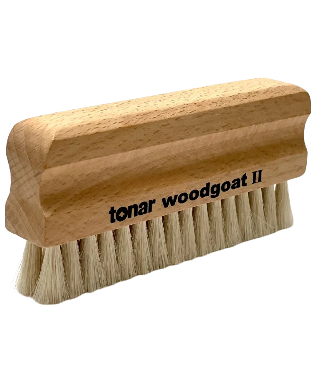 216073 Tonar Woodgoat-II. Losse geitenharen applicatieborstel met een dubbele rij, extra lang, borstelhaar in een houten greep. Voor gebruik met QSA Vinylcleaner of andere plaat-cleanfluid.